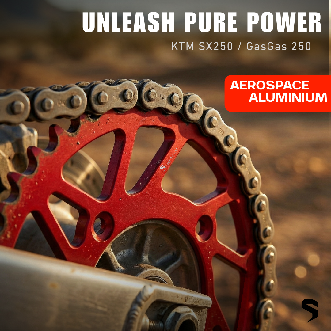 Aerospace aluminium CNC rear sprocket for KTM SX250 / GasGas 250. Lightweight, hard anodised, and built for racing performance. Available in 49T–53T for 520 chain.